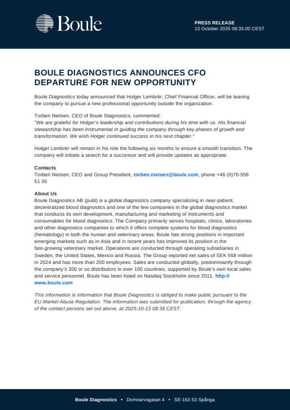 Boule Diagnostics CFO lämnar för ny möjlighet 13 Oct, 2025