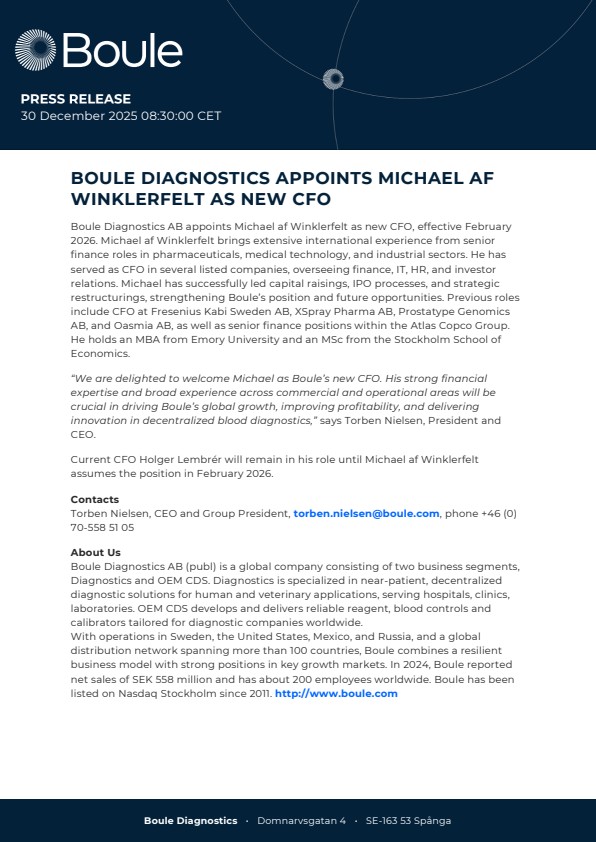 Boule Diagnostics appoints Michael af Winklerfelt as new CFO 30 Dec, 2025