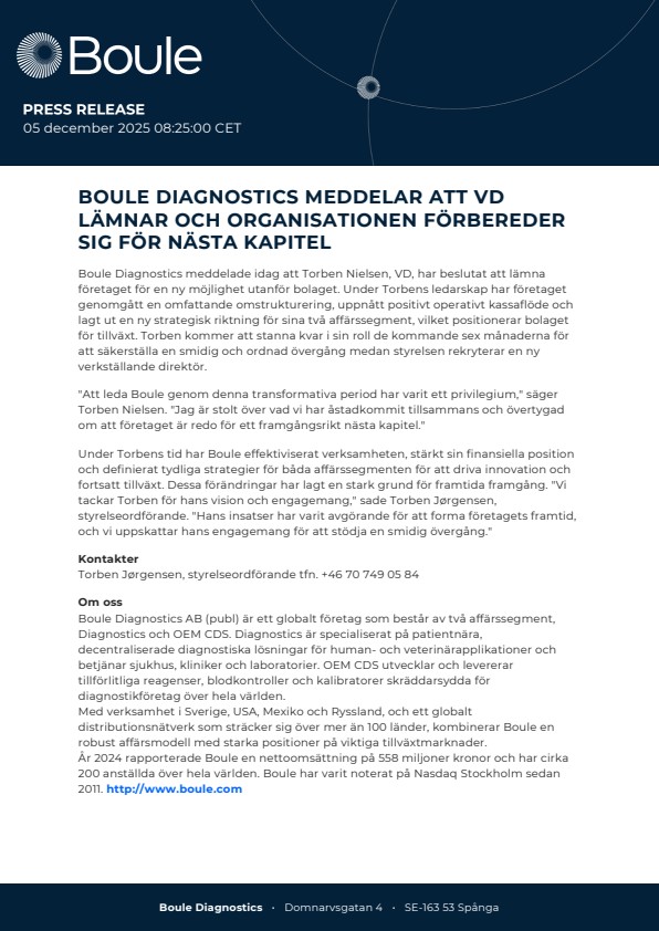 Boule Diagnostics meddelade idag att Torben Nielsen, VD, har beslutat att lämna företaget för en ny möjlighet utanför bolaget. Under Torbens ledarskap har företaget genomgått en omfattande omstrukturering, uppnått positivt operativt kassaflöde och lagt ut en ny strategisk riktning för sina två affärssegment, vilket positionerar bolaget för tillväxt. Torben kommer att stanna kvar i sin roll de kommande sex månaderna för att säkerställa en smidig och ordnad övergång medan styrelsen rekryterar en ny verkställande direktör.