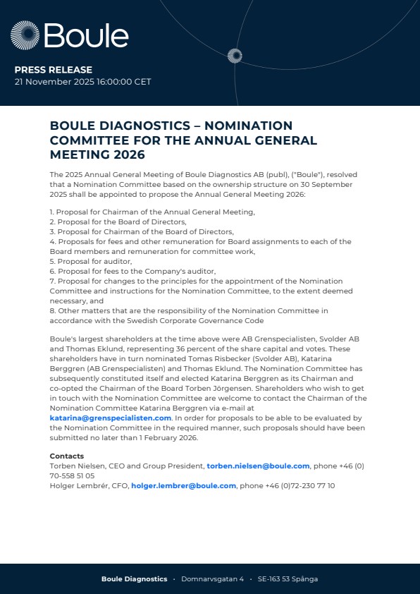 The 2025 Annual General Meeting of Boule Diagnostics AB (publ), (“Boule”), resolved that a Nomination Committee based on the ownership structure on 30 September 2025 shall be appointed to propose the Annual General Meeting 2026: