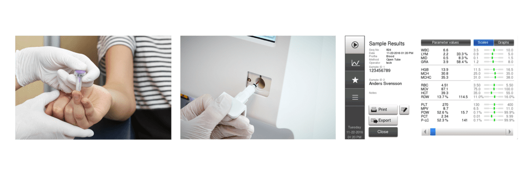 Swelab Alfa Plus analyzer features MPA sampling. Simply make a finger stick, draw blood into a special 20 μL micro-capillary tube, slide it into the adaptor, and insert in the analyzer. About one minute later, you view all the key results on the touchscreen. There is no preparation, no pre-dilution, no vacuum tubes and no needles. As well as making fast, pre-donation blood cell determinations, MPA also saves the vein for donation.